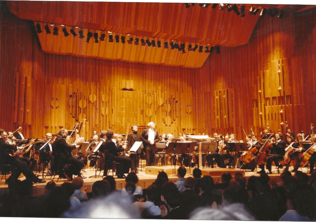 Mstislav Rostropovich and Robert Saxton with the LSO following the world premiere of Robert’s Cello Concerto, conducted by Oliver Knussen